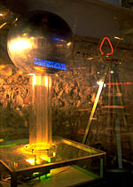 A glass globe, containing gases at low pressure, has a high voltage and a radio transmitter at its centre. Tendrils of glowing plasma