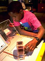 In this cathode ray tube electrons are revealed as they hit a fluorescent screen (as in a TV). You can experiment on the electrons with